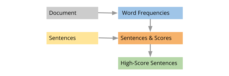 For each sentence in the text, look for groups of important words. A group is made of important words that have at least four unimportant words between them. Using the number of important words and the total number of words in the sentence, compute a “score” for the sentence. This score tells you how important the sentence is. Pick the sentences with the highest score. These sentences will give you the abstract.