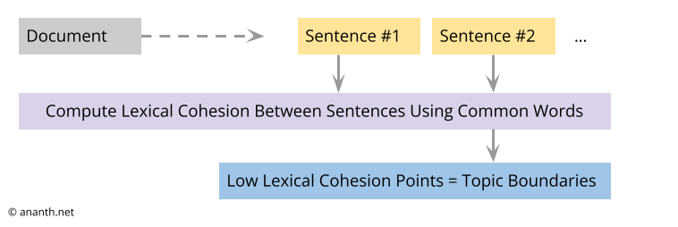 To implement this, the text is divided into blocks of sentences. These blocks are then compared with each other to calculate a cohesion score. The idea is to measure how much vocabulary is shared between adjacent blocks. If two consecutive blocks share a lot of vocabulary, their cohesion score will be high. On the other hand, if they don’t share much vocabulary, the cohesion score will be low, potentially indicating a topic boundary.