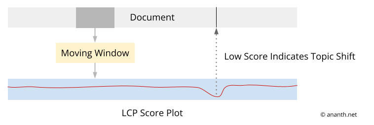 LCP is derived by moving a fixed-width window across the text and calculating the cohesiveness of the words within that window. The cohesiveness of a set of words is scored based on the semantic relationships between words and their significance in a corpus. If the words within the window are from the same segment (or topic), they are expected to be cohesive, leading to a higher value in the LCP. Conversely, if the window spans a segment boundary, the words will be less cohesive, resulting in a dip or valley in the LCP. Plot the LCP and identify the the minimum points in the plot. These points correspond to the topic or segment boundaries.