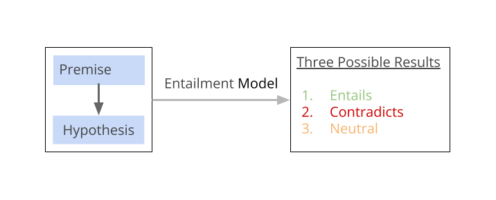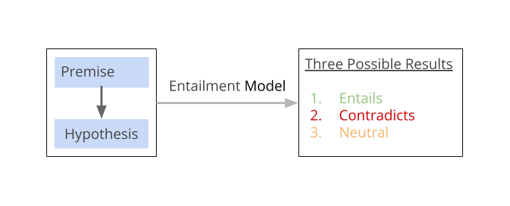 For example, consider the premise: “The elephant is trumpeting”, and the hypothesis: “The elephant is making noise”. In this example, the hypothesis “The elephant is making noise” can be logically inferred from the premise “The elephant is trumpeting”. So, the relationship between the premise and the hypothesis is “entailment”.