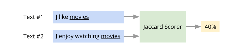 The number of words that occur in both the sentences is two (“I”, “movies”). The total number of unique words across the two sentences is five (“I”, “like”, “movies”, “enjoy”, “watching”). Here, the Jaccard similarity score = 2/5. That is, 40% similarity. The idea of text similarity is has several applications. For example, given a question and a collection of sentences that are potential answers to the question, the most likely answer to the question is the one with the highest similarity score.