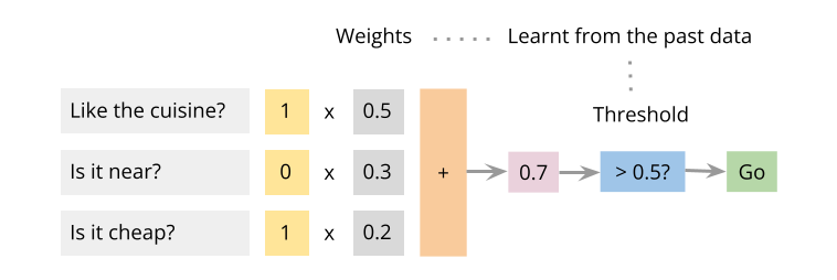 These weights represent how important each factor is in your decision-making process. The perceptron works by multiplying each factor (input) by its weight, then adding up these weighted inputs. If the total exceeds a certain threshold (let’s say 0.5 in this case), you decide to go to the restaurant; if not, you stay home.