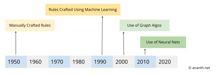 Up until recently, the text summarization was accomplished using two steps. #1 identify the key sentences #2 put them together to generate the summary. In the 1950s, researchers manually crafted rules to identify the key sentences. In the 1990s, researchers used ML algorithms to craft rules to identify the key sentences. In the 2000s, researchers used graph algorithms to identify key sentences, after representing the text as a graph! In the 2010s, researchers used neural networks to identify the key sentences. From 2017 and onwards, researches having been using a neural network architecture called Transformer to generate new text that amazingly summarizes the original document.